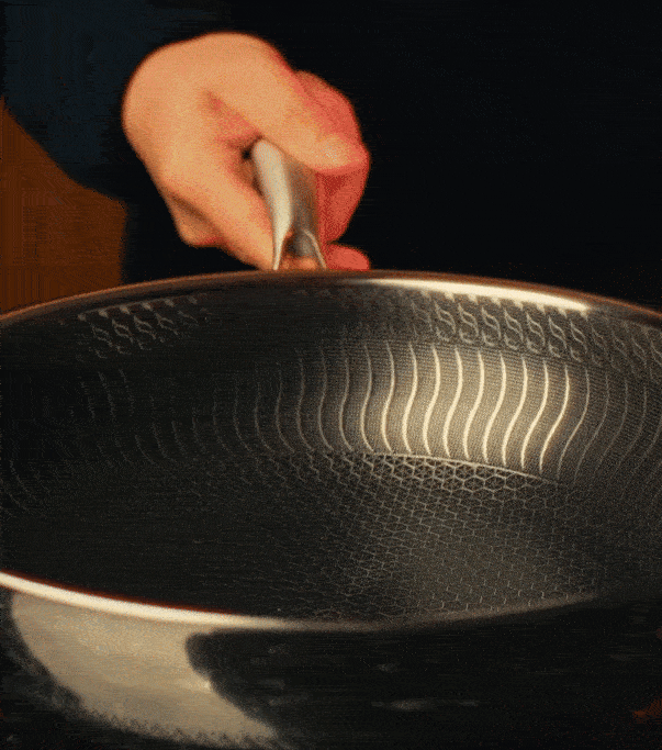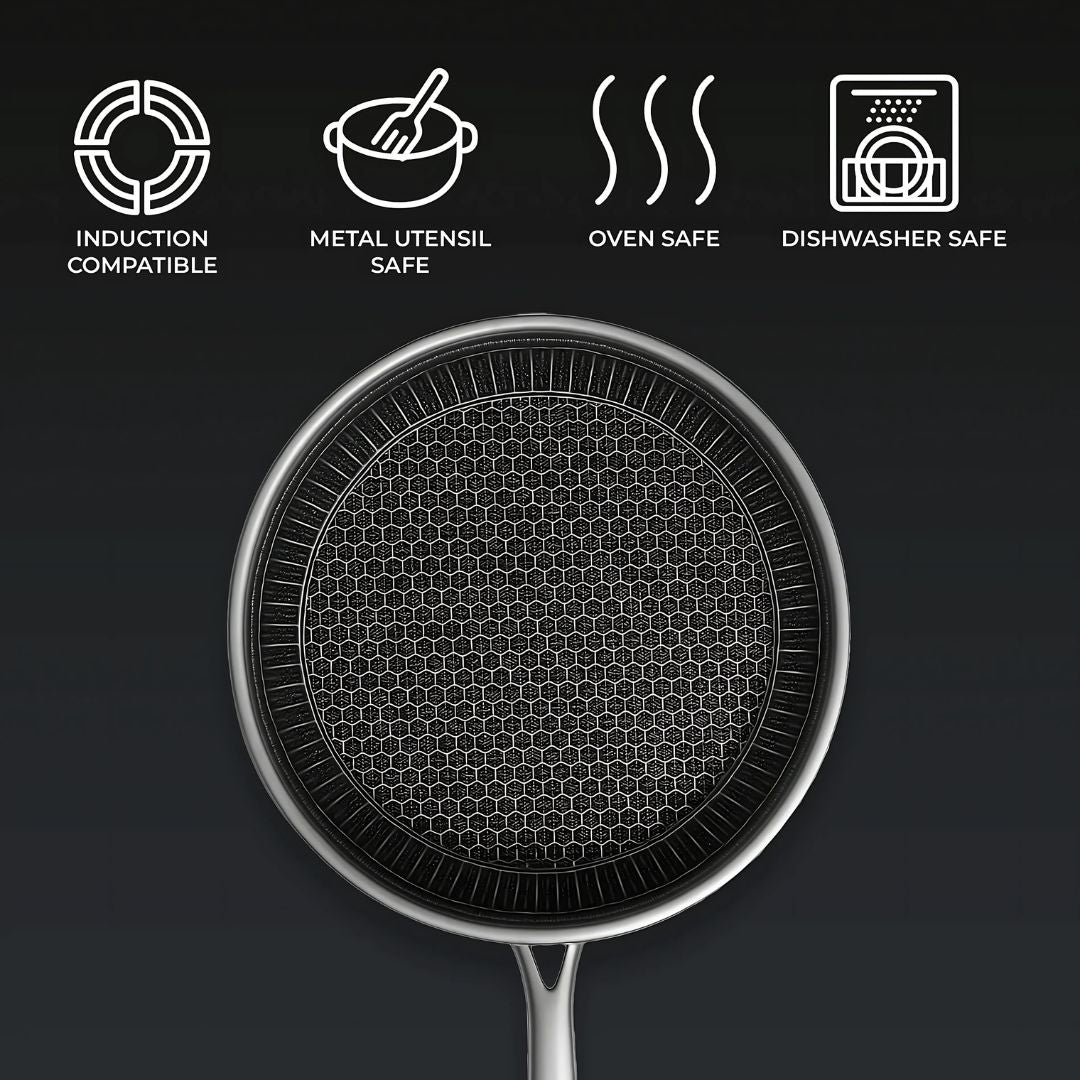 Experience the best of both worlds stainless steel searing and nonstick release. The patented hybrid pan uses a hexagonal laser-etched design layered between stainless steel and aluminum, ensuring even heat and effortless food release without chemical coatings or flaking surfaces.