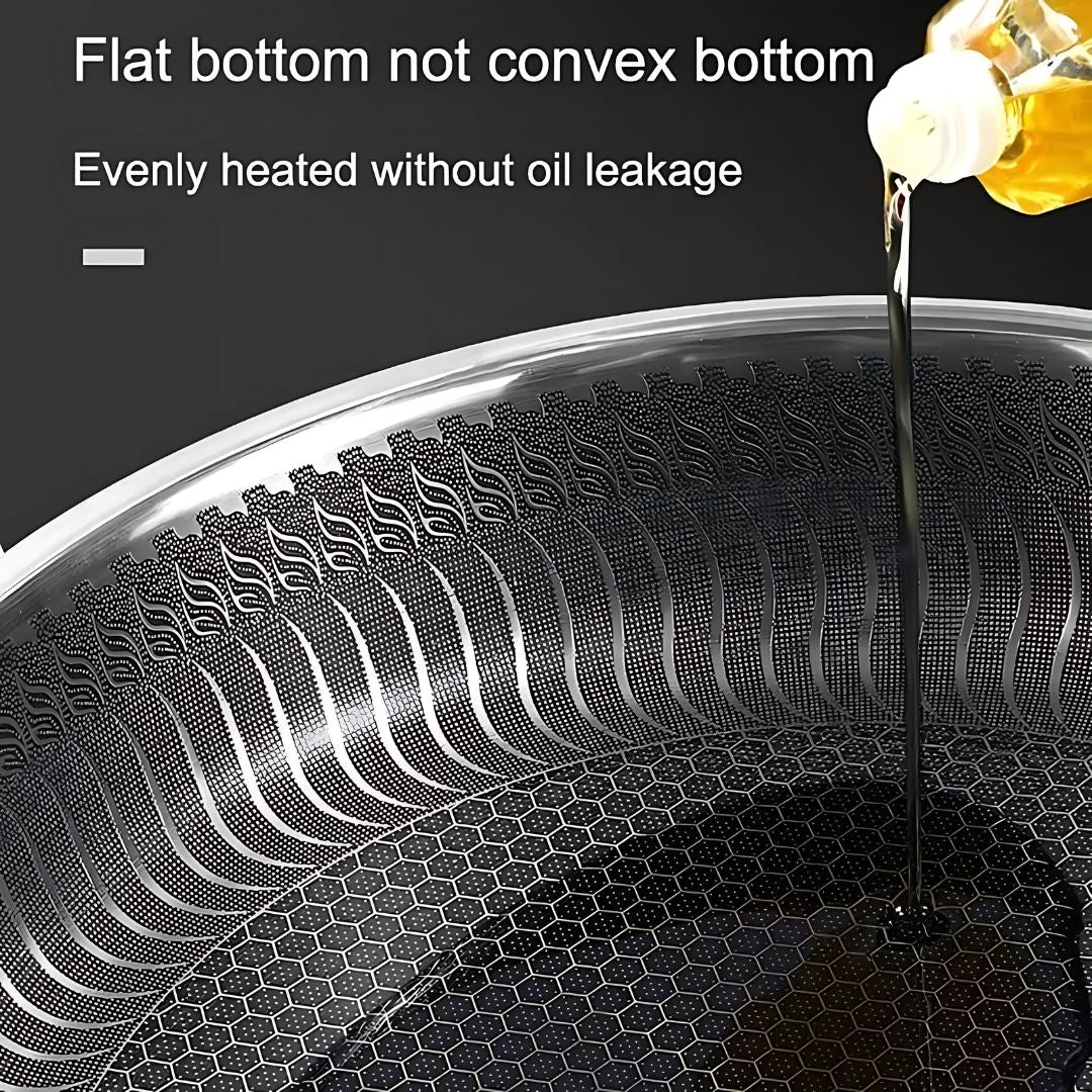 This pan’s triple-layer build includes a high-grade stainless steel base, a conductive aluminum core, and a stainless top layer with elevated non-stick texture. The structure delivers precision heat while minimizing food contact points, which helps reduce sticking and promotes healthier cooking with less oil.